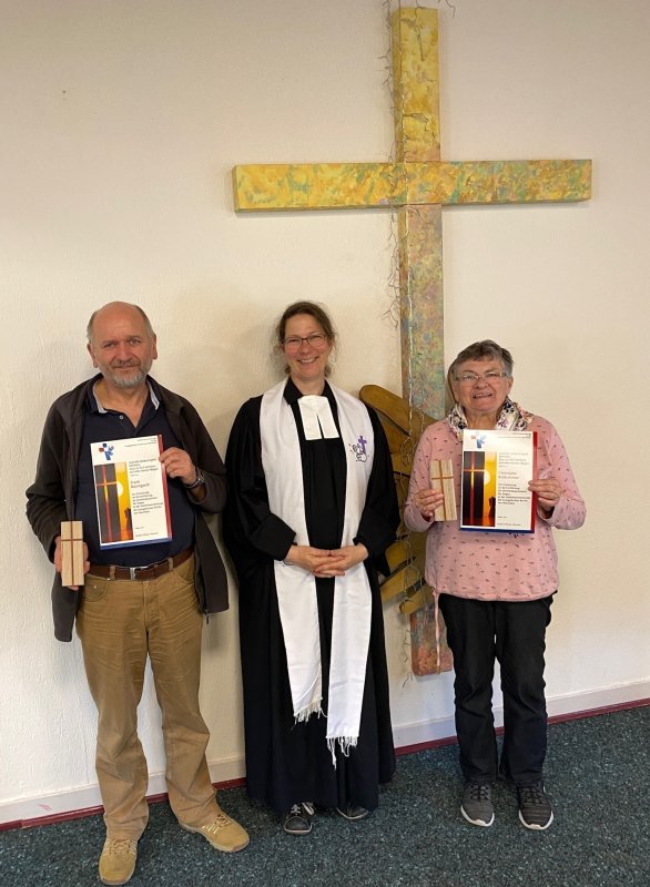 Es hat etwas gedauert in diesem Jahr, bis wir in Siegen die Gemeindesprecherwahl machen konnten. Doch im Mai war es endlich soweit. Die Gemeinde hat das langjährige Team erneut im Amt bestätigt. Die Gemeindeglieder sprachen Christiane Krätschmar und Frank Baumgardt ihr Vertrauen aus. Aber Gemeindesprecher brauchen neben dem Vertrauen der Gemeinde und der Pfarrerin eins natürlich auch: Gottes Segen. Deshalb segneten wir im Juni-Gottesdienst die beiden für ihre Arbeit. Als Zeichen und als Erinnerung gab es eine Urkunde und ein Kreuz. Das Besondere an dem Kreuz: Es ist aus Glas und steckt in einem Holz-Block. Wenn die Sonne von hinten auf das Kreuz scheint, dann leuchtet es vorne warm und hell durch das harte Holz. Das ist wie bei unserem Glauben: Oft ist unser Leben hart wie Holz. Doch Gottes Liebe scheint auch in harten Zeiten. Das kann nicht jeder erkennen. Aber wir glauben an Jesus Christus. Das Kreuz ist sein Symbol. Durch ihn strahlt Gottes Liebe in unser Leben. Wir wünschen dem wiedergewählten Gemeindesprecher-Team: Ihr sollt Gottes Liebe immer wieder spüren. sie soll euch die Kraft für euer Amt schenken!