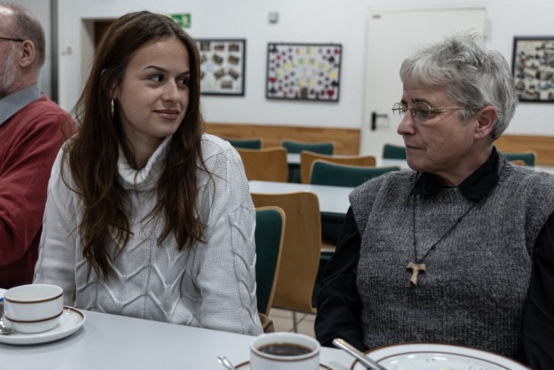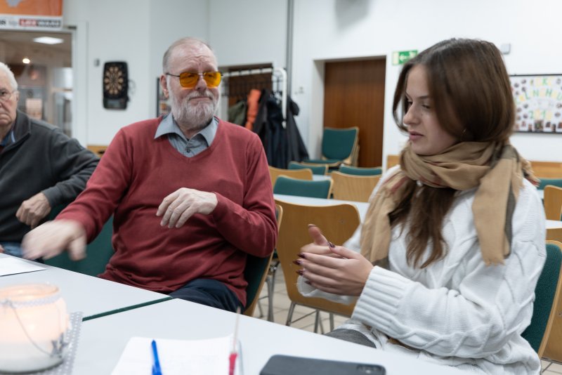 Die bereits erwähnte Leiterin des Treffs Ulrike eine sehr offen wirkende lächelnde ältere Dame fing an mir von ihrer Geschichte zu erzählen. Von ihrem Weg dass ihre Eltern früher glaubten sie wäre zu faul zum reden und dass erst nach geraumer Zeit festgestellt wurde, dass sie gehörlos war. Sie erzählte wie sie die Gebärdensprache von anderen Kindern deren Eltern die Gehörlosenspache beherrschten auf dem Schuhlhof lernte und dass ihre Lehrer kein Verständnis für die Behinderung hatten und deshalb immer mit dem Gesicht weggedreht mit den Kindern sprachen damit sie ihre Lippen nicht lesen konnten. Sie erzählt dass wenn sie Gebärdensprache in der Öffentlichkeit sprach aufgefordert wurde dies zu unterlassen, da die Leute gucken würden. Dass sie deshalb keinen Mut hatte und sich im Endeffekt darüber hinwegsetzte und zu ihrer Gehörlosigkeit stand. Ich hatte so viele Fragen. Sie und der Pfarrer Hendrick erzählten mir über so viele interessante Einblicke in die Gehörlosenwelt wie das Lormen zum Beispiel welches die Kommunikationsweise der Taubblinden ist. Sie erzählten über internationale Gebärdensprache. Darüber dass man sich über die Länder hinaus brüchig auf Gebärdensprache unterhalten kann trotz der anderen Sprache. Mir wurde von Musik erzählt. Dass es eine Art Kopfhörer gibt die die Vibration aufs Schlüsselbein überträgt und man so die Vibration der Musik spüren kann. Ich erfahre, dass sich Gehörlose mit Leuten die nicht über die Gebärdensprache mächtig sind über Schrift unterhalten. Viele Gehörlose lesen auch die Lippen der Sprechenden.