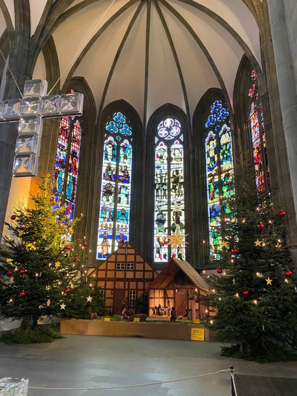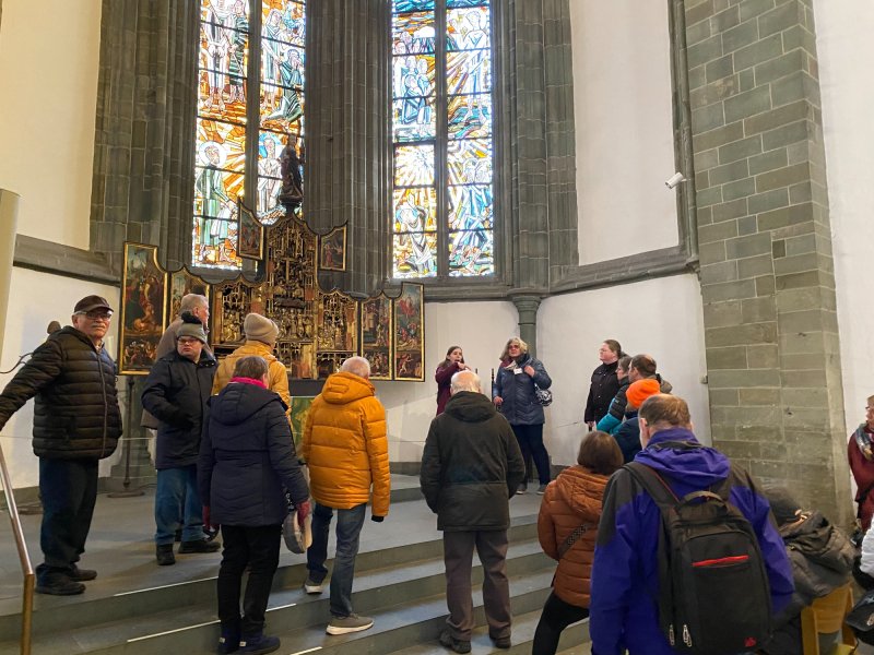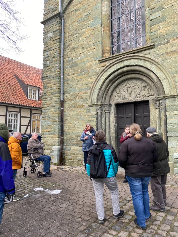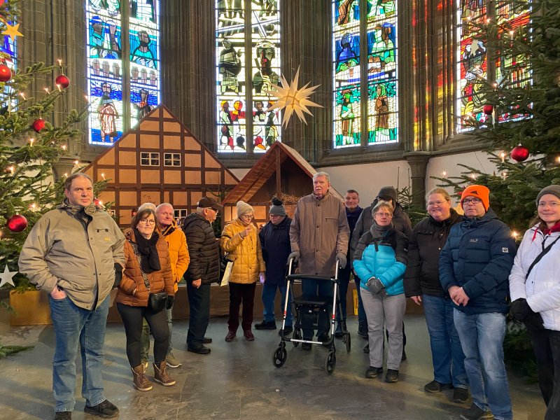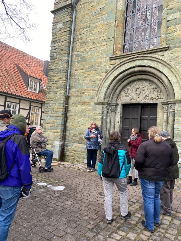 Zunächst werden die St. Petri-Kirche und der Dom St. Patrokli besucht. Die Stadtführerin beschreibt die Krippen mit dem besonderen Aufbau einer westfälischen Landschaft. In der Wiesenkirche ist das Altarbild mit der Geburtsszene ein besonderer Ort. In der Hohnekirche hält Pfarrerin Bunse-Großmann eine Andacht zu den Worten der Jahreslosung: ‚Prüft alles und behaltet das Gute‘. Nach dem Spaziergang bei eisigen Temperaturen freute sich die Gruppe, im Gemeindehaus an der Hohnekirche bei Kaffee und Kuchen noch gemeinsame Zeit zu verbringen.