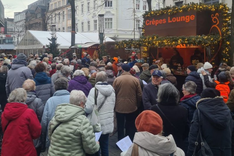 Am Samstag vor Weihnachten kamen sehr viele Menschen in die Herner Innenstadt. Auf der Bahnhofstraße war kaum noch Platz. Das offene Advents- und Weihnachtsliedersingen zog mehr Besucher*innen an als in den Jahren davor.
