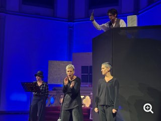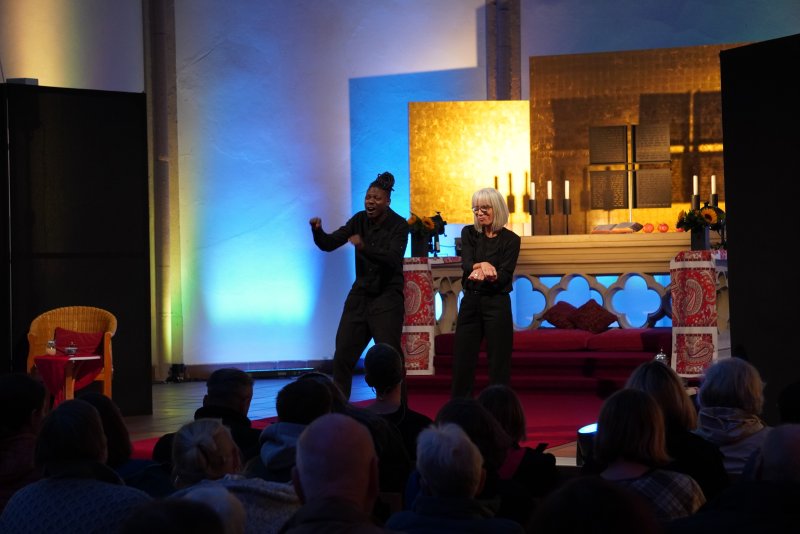 Ein Höhepunkt war die Performance der gehörlosen Erzähler*innen Sabine Schlechter und Dodzi Doughban. Ihre lebendige Gebärdensprache und der starke Ausdruck beeindruckten das Publikum sehr. Die Musik an der Orgel unterstützte die Geschichten und machte sie noch eindrucksvoller.