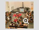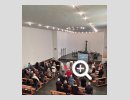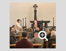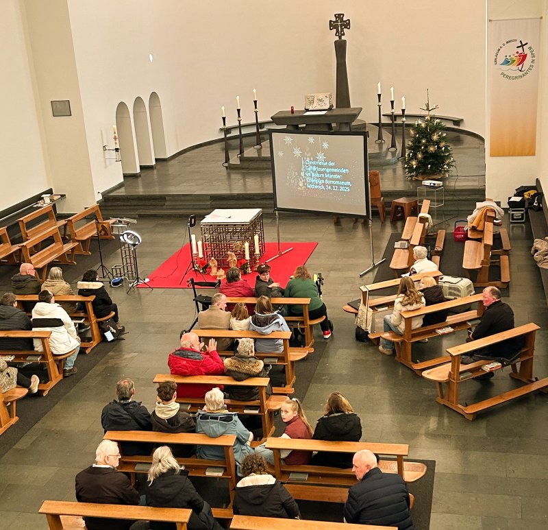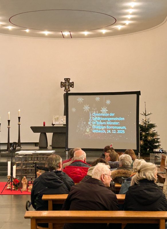 Seit vielen Jahren ist es Tradition: Der Gottesdienst am Heiligabend in der Kapelle des Borromäums in Münster. Hier ist das Priesterseminar des Bistums Münster. Heiligabend ist niemand hier. So können wir die große Kapelle für den Weihnachtsgottesdienst benutzen. Um 14 Uhr geht es los. Das ist sehr früh für einen Heiligabendgottesdienst. Die Gehörlosen sind die ersten im Bistum Münster, die den Weihnachtsgottesdienst feiern. Aber alle wollen auch rechtzeitig nach Hause zurück zur Bescherung. Fünfzig Personen sind gekommen, einige Kinder sind mit dabei. Das Gottesdienstteam besteht aus Pfarrer Wolfgang Schmitz, den Gehörlosenseelsorgerinnen Monika Prillwitz und Anne-Merle Kohlschreiber, den Wortgottesdienstbevollmächtigten Karsten Kißler und Michael Rubbert, und Pfarrer Christoph Hauschild.