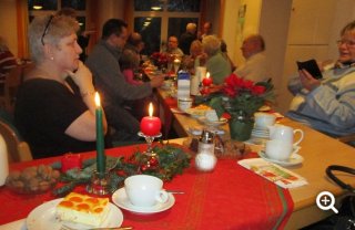 Mit über 35 Personen begann ab 14.45 Uhr der Weihnachtsgottesdienst, um dann am sehr schön gedeckten Tisch die Weihnachtsfeier im kleinen Raum bei Kaffee und Kuchen zu feiern. Günter Wehmeier begrüßte anschließend die Gäste und sagte, dass heute der Weihnachtsmann nicht zu uns kommen kann, weil draußen kein Schnee liegt. Er verteilte aber die Geschenke mit Hilfe der Gemeindesprecherinnen Doris Wehmeier und Britta Büker an alle Gäste. Unsere Pfarrerin Antje Eltzner-Silaschi bedankte sich für die Hilfe und Mitarbeit der GemeindesprecherInnen und bei Günter Wehmeier und verteilte ebenfalls Geschenke an die Mitarbeitenden. Alle Gäste bekamen die Losungsbücher für 2016. Viele Gäste blieben noch sehr lange zusammen bis in den späten Abend. Viele sagten einhellig: Es war eine sehr schöne Weihnachtsdeko am Tisch! Darüber haben wir uns sehr gefreut und bedankt.