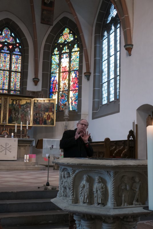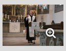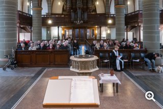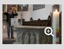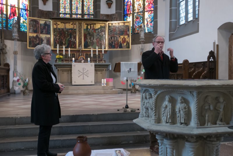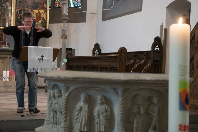 Vor dem Segen wurden Kerzen mit dem neuen Logo der westfälischen Gehörlosenseelsorge für die Gemeinden im Ruhrgebiet verteilt. Am Ausgang bekam jeder Besucher ein Osterei und zur Erinnerung an das Thema des Gottesdienstes eine Karte, auf der ein großer Stein unter dem Kreuz zu sehen ist.