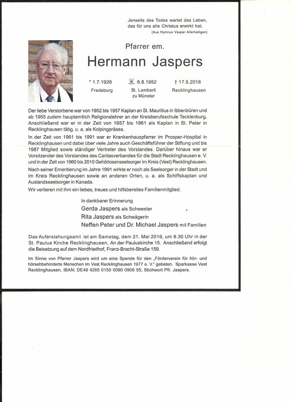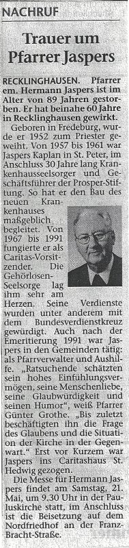 Pfarrer em. Herrmann Jaspers war 50 Jahre lang der katholische Gehörlosenseelsorger in Recklinghausen. So war er sehr bekannt bei allen Gehörlosen im Kreis und darüber hinaus.Besonders wurden seine zugewandte Art und sein Humor geschätzt.