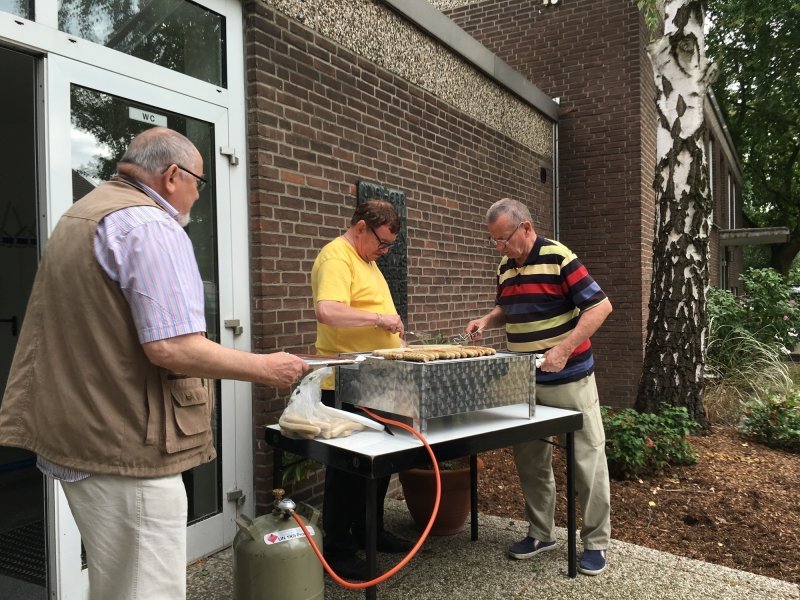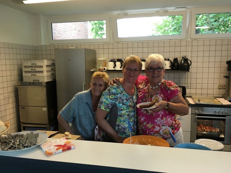 Im August ist das Gemeindehaus an St. Georg in Lünen geschlossen. Deshalb macht der Mittwochstreff dann einen Ausflug. Vorher wurde aber noch einmal kräftig gefeiert. Die Grillmeister feuerten den Grill an und die Küchenfeen bereiteten leckere Salate. Aus vielen Gehörlosengemeinden kamen die Besucher. Der Saal füllte sich immer mehr.