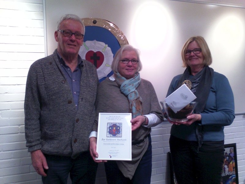 Ende Januar hat das Ehepaar Arnsburg seine Goldene Hochzeit in der Gehörlosengemeinde gefeiert. Sie wurden im Gottesdienst gesegnet und haben eine Urkunde bekommen. Anschließend war die Gemeinde zu Kaffee und Kuchen eingeladen. Die Gemeindesprecherin Frau Klein hat ein kleines Geschenk der Gemeinde überreicht. Wir wünschen beiden Gottes Segen und dass sie noch lange gesund zusammen sind.