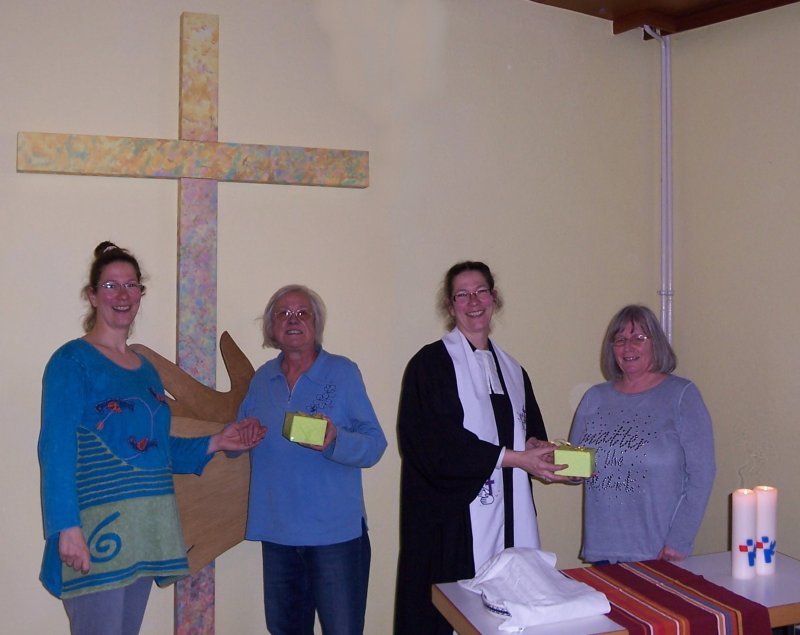 25 Jahre Ehrenamt. Für die Gemeinde. Das ist eine lange Zeit. Nach so langer Zeit hat die Gehörlosengemeinde Siegen nun ihre beiden Gemeindesprecherinnen Margit Kolodziej und Marianne Viereck verabschiedet. Schon im Januar-Gottesdienst verabschiedete Pfarrerin Plümer Marianne Viereck im Gottesdienst. Eis und Schnee hielten Margit Kolodziej damals vom weiten Weg nach Siegen ab. Deshalb holten wir jetzt im April beim österlichen Kaffee-Trinken die Verabschiedung nach. Beide erhielten ein kleines Geschenk – ein symbolischer Dank, denn die Zeit und das Engagement so vieler Jahre sind mit Geschenken gar nicht aufzuwiegen.