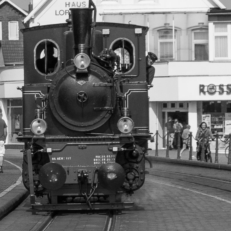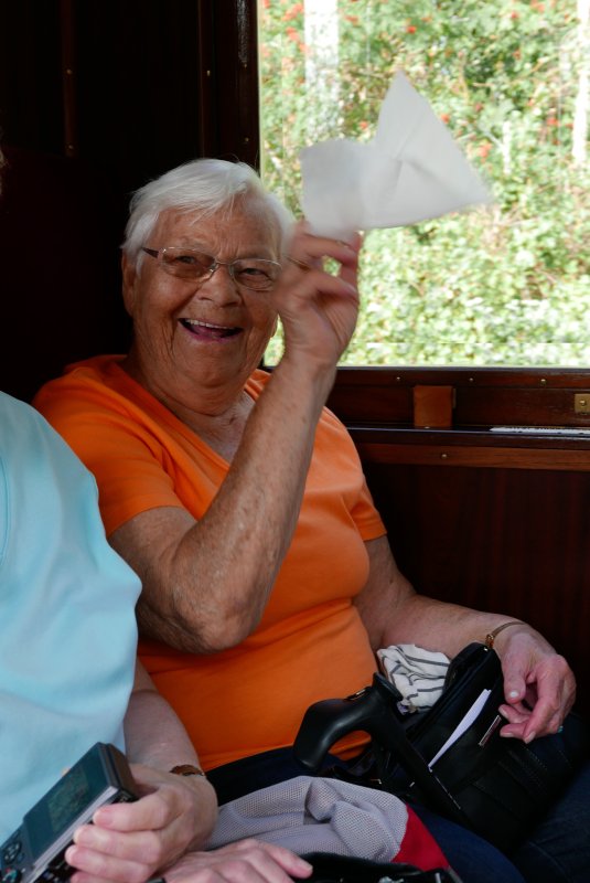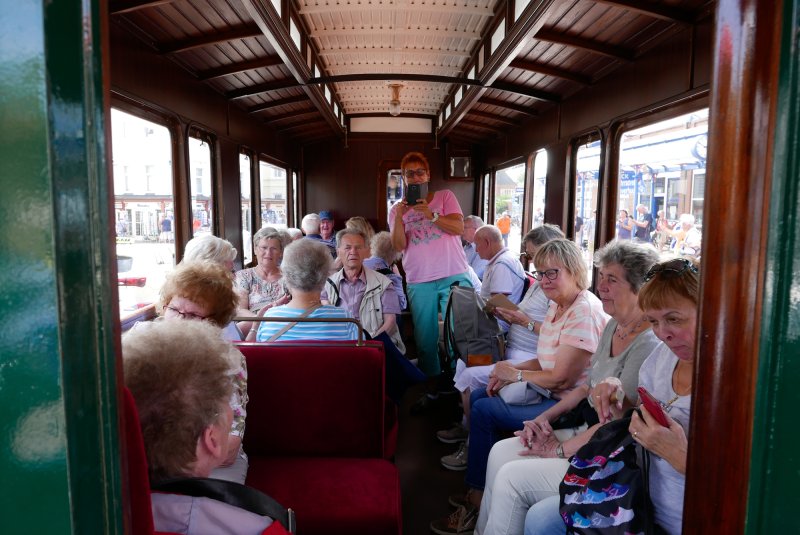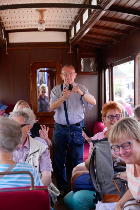 Mittwoch Nachmittag ging es dann wieder auf Rädern los: Die Fahrt mit der Borkumer Nostalgiebahn war auch ein schönes Erlebnis, zumal in dem eleganten Waggon mit Polstersitzen, holzverkleideten Wänden und schönen Lampen.