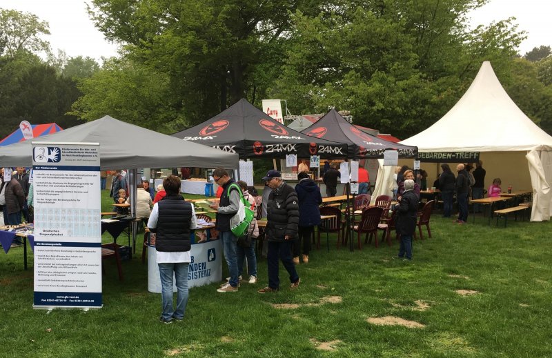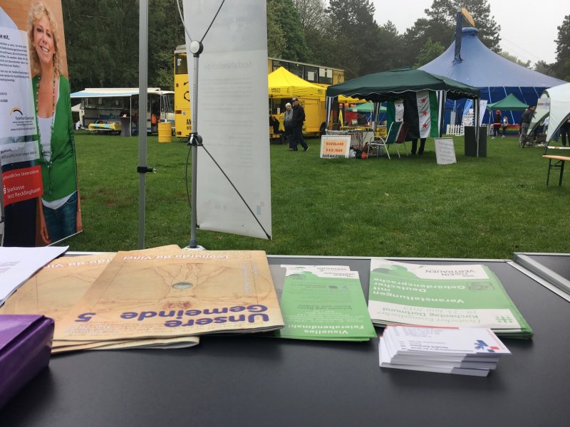Der 1. Mai, der Tag der Arbeit, wird in Recklinghausen immer mit einem großen Volksfest gefeiert. Die Ruhrfestspiele werden eröffnet. Und dabei gibt es auch einen Stand der Seelsorge im Kirchenkreis Recklinghausen. Neben Hospiz, Krankenhausseelsorge und Notfallseelsorge war dies Jahr auch Pfarrer Hendrik Korthaus mit Informationen zur Gehörlosenseelsorge vertreten. Schön, wenn gleich nebenan der große Stand des Vestischen Gehörlosenvereines und der der Taubenblindenassistenz ist.