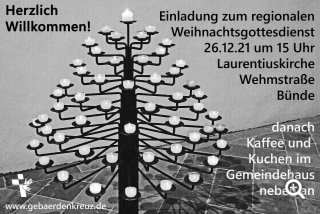 Herzliche Einladung zum regionalen Weihnachtsgottesdienst in Ostwestfalen am 26.12.21 um 15 Uhr in der Laurentiuskirche in Bünde. Nach dem Gottesdienst gibt es Kaffee und Kuchen im Gemeindehaus nebenan. Ort: Wehmstraße 4 in Bünde
