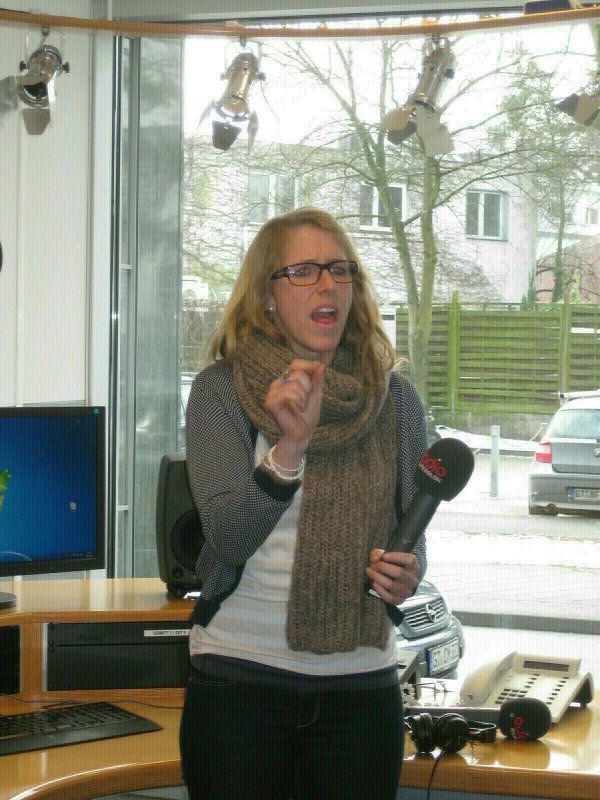 Mit den fertigen Texten eilen sie dann schnell ins Tonstudio – aber laufen ist verboten. Warum? Niemand möchte einen Nachrichtensprecher hören, der außer Atem ist und nach Luft schnappt. Und auch wenn es noch so früh am Morgen ist: die Stimme darf nicht müde klingen. Außderdem soll sie sich freundlich anhören. Darum lächeln die Sprecher und Sprecherinnen beim Lesen, auch wenn es im Radio keiner sieht. Während der Sprecher “auf Sendung” ist, leuchtet eine rote Lampe “on air”. Jetzt darf auf keinen Fall gestört werden.Neben dem Nachrichtensprechen gibt es noch mehr zu tun: Nur mit einem Mikrofon (es nimmt auf und speichert gleichzeitig) besuchen die Mitarbeiter Veranstaltungen um mit Orginaltonaufnahmen darüber zu berichten. Diese Aufnahmen müssen im Schneideraum am Computer zusammengeschnitten werden. Außerdem gibt es Konferenzen zur Arbeits- und Aufgabenverteilung. Gezeigt und erklärt hat uns das alles freundlicherweise Frau Ulrike Drevenstedt. Sie ist freie Mitarbeiterin bei Radio Güterslo und liest dort auch selbst Nachrichten. Und weil sie die Tochter von Frau Marianne Drevenstedt ist, die den Frauentreff unserer Gehörlosengemeinde leitet, hat sie alles in Gebärdensprache erzählt.