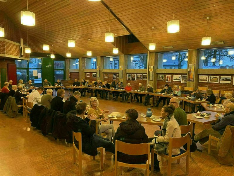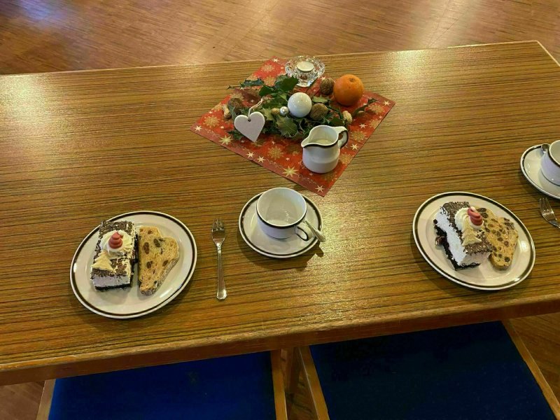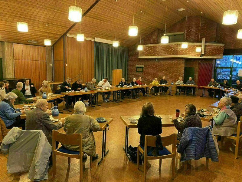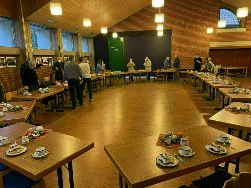 Die vielen Besucherinnen und Besucher freuten sich nach dem Gottesdienst zum Thema „Josef – eine wichtige Nebenrolle“ auf das gemütliche Kaffeetrinken mit Kuchen im Gemeindehaus. Weil der Gemeindesaal so groß ist, konnten alle mit Abstand und dem Befolgen der 2-G-Regel und allen Hygieneregeln daran teilnehmen.