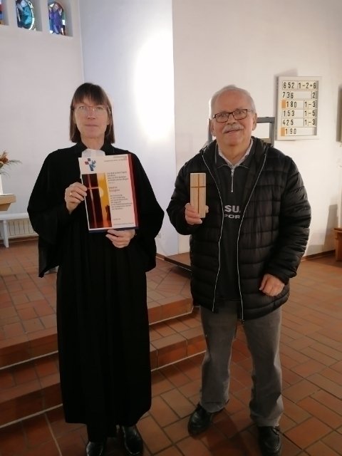 20-jährige Mitarbeit als Gemeindesprecher in Lippstadt. Im Gottesdienst in der Friedenskirche in Bad Waldliesborn segnete Pfarrerin Bunse-Großmann ihn. Die Seelsorgerin überreichte die Urkunde der westfälischen Gehörlosenseelsorge mit einem Lichtkreuz und guten Wünschen für die weitere Mitarbeit.