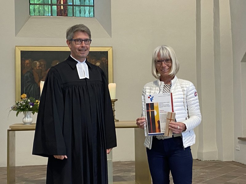 Im Mai haben wir das nun endlich geschafft. Sabine Schlechter wurde im Gottesdienst am 8. Mai für das Amt der Gemeindesprecherin eingesegnet. Der Segen wurde von Pfr. Schröder gesprochen. Er überreichte Sabine Schlechter auch eine Urkunde und das Lichtkreuz zur Einsegnung. Wir sind froh, dass wir sie haben!