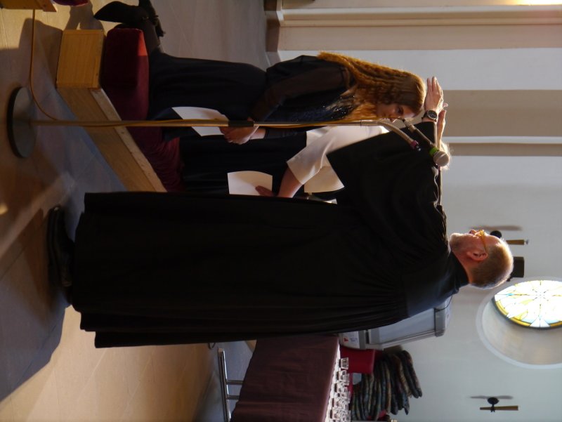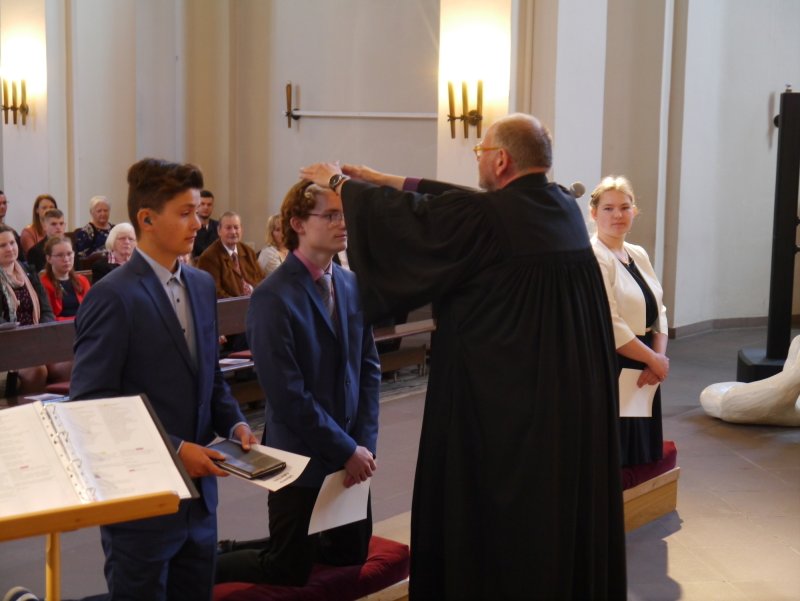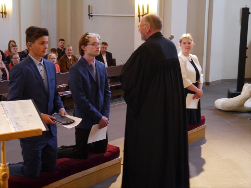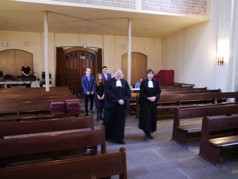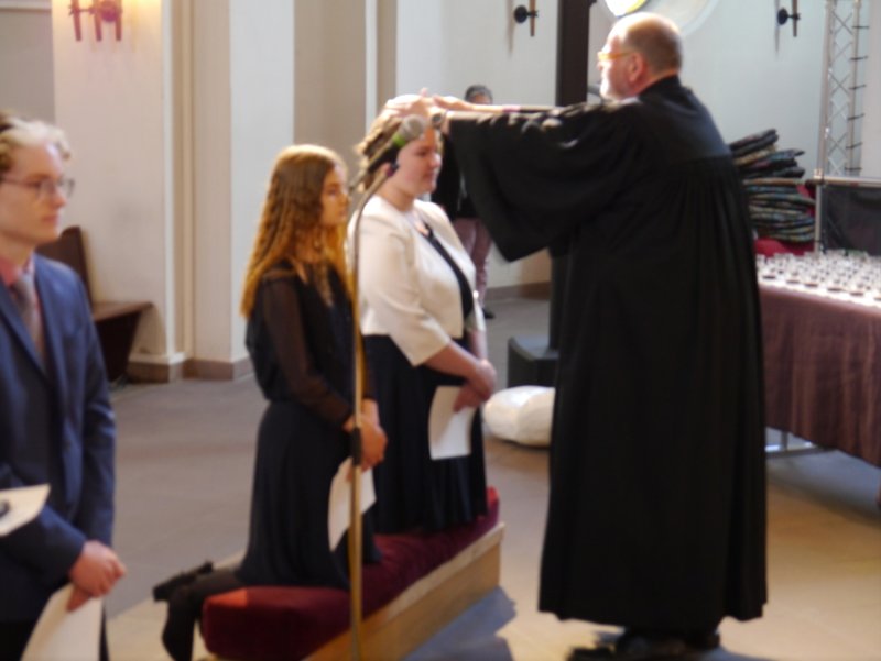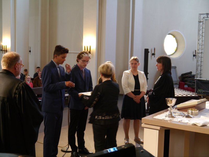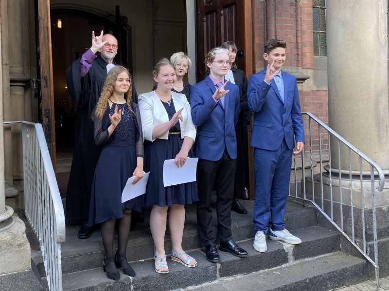 Am 28. Mai war es endlich so weit. Die lange Zeit des Konfirmationsunterrichts war zu Ende. Nachdem in den letzten Monaten zusammen mit Marina Hoffmann von der Rheinisch-Westfälischen Realschule Dortmund und Pfarrer Hendrik Korthaus fleißig gelernt und diskutiert wurde, war der große Tag da. Davina Beer, Amelie Zedler, Fabian Kostra und Calvin Zedler wurden konfirmiert. „In Gottes Hand“ war das Thema des Gottesdienstes in der Pauluskirche Dortmund. Die Gehörlosenseelsorger Pfarrerin Heidi Bunse-Großmann und Pfarrer Hendrik Korthaus predigten über die verschiedenen Funktionen menschlicher Hände und über Gottes segnende Hand. Zusammen mit Marina Hoffmann segneten sie die 4 jungen Menschen uns sprachen ihnen ihren Konfirmationsspruch zu. Zum ersten Mal konnten sie dann zusammen das Heilige Abendmahl feiern. Nachdem dem Gottesdienst wurde in den Familien fröhlich weiter gefeiert.