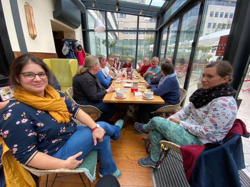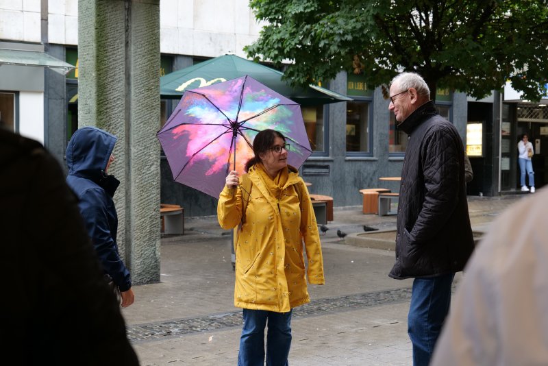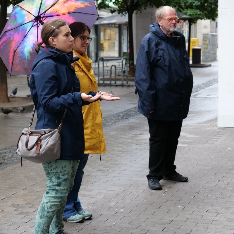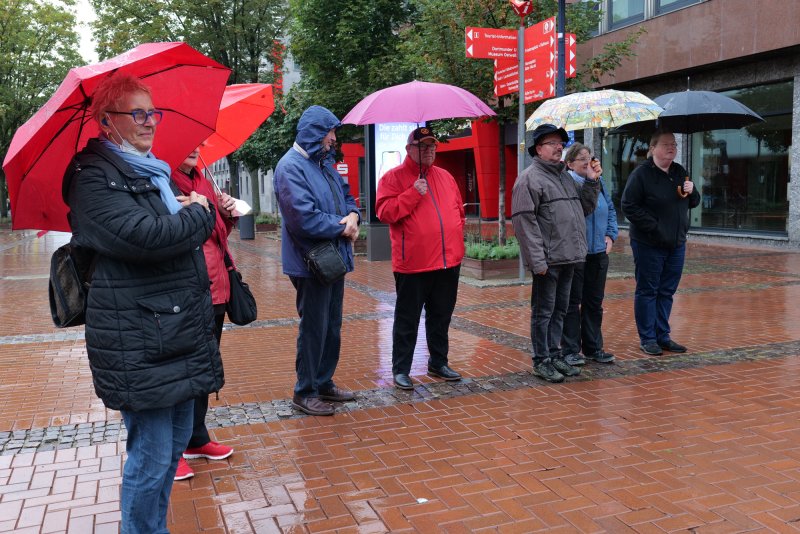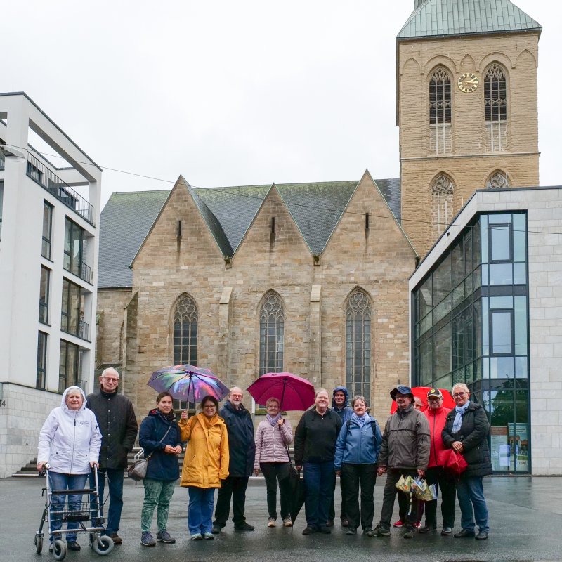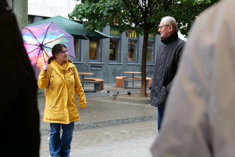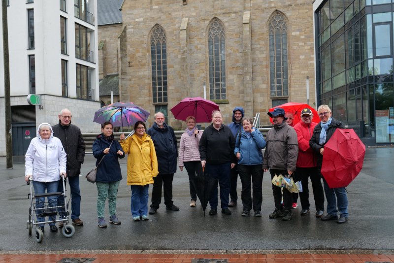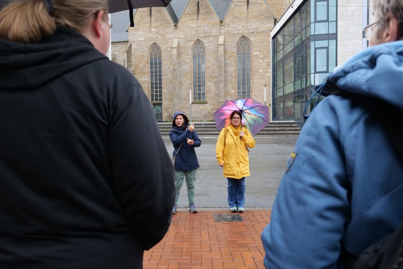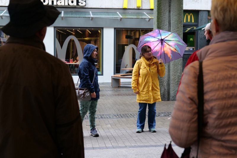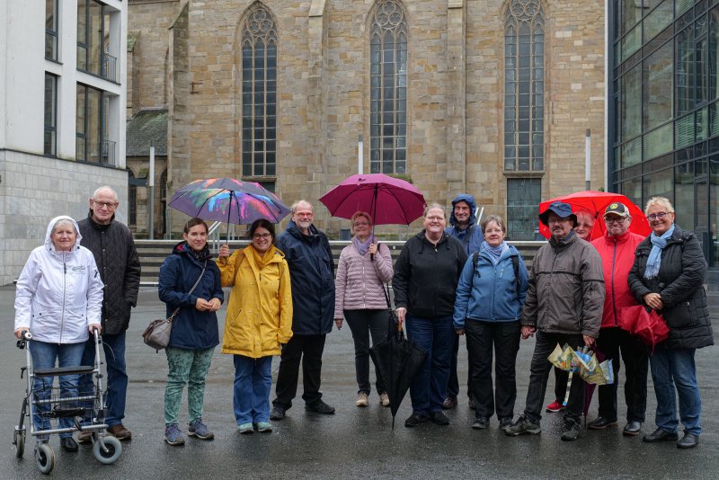 Schon zum zweiten Mal konnte ihm Rahmen des Projektes StadtPilgerTouren des Ev. Bildungswerkes Dortmund und der Ev. Stadtkirche St. Petri gepilgert werden. Am 18. September trafen sich rund 15 Menschen an der St. Petrikirche in Dortmund. Unter der fachkundigen Leitung von Dr. Johanna Beate Lohff und gedolmetscht von Michaela Klenner ging der Weg durch die Innenstadt entlang des Westenhellwegs zur Reinoldikirche und zur Marienkirche. Trotz des starken Regens und herbstlichen Wetters war es sehr interessant und spannend. Es gab viele Neuigkeiten. Nicht nur über die Kirchen, sondern auch über die Geschichte des Westenhellwegs von der mittelalterlichen Handelsstraße zur ersten Fußgängerzone in Deutschland. Besonders interessant war die Geschichte der Krügerpassage, die 1912 erbaut wurde. Begleitet wurde die Pilgertour von den Gehörlosenseelsorgern Pfarrerin Christine Brokmeier und Pfarrer Hendrik Korthaus. Anschließend konnten sich die Teilnehmenden nach einer letzten Übungseinheit im Café Extrablatt mit leckerem Essen und warmen Getränken aufwärmen und stärken. Außerdem wurden schon Ideen für weitere Exkursionen ausgetauscht.