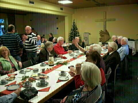 In der Predigt vergleicht Pfarrerin Plümer das neue Licht mit dem Stern von Betlehem: Es gibt Orientierung und schenkt uns Licht. So wird Kommunikation und Gemeinschaft möglich. Nach dem Gottesdienst wartet ein leckeres Kuchenbüffet: selbst gebackene Kuchen und Torten, aber auch Siegerländer Kartoffelbrot und belegte Brötchen für die Zuckerkranken. Da greift auch der stellvertretende Bürgermeister mit seiner Familie gerne zu. Die Behindertenbeauftragte der Stadt und Herr Würlich von der Beratungsstelle können leider nicht kommen – sie sind krank. Dafür gibt es anderen Besuch. Der ist für die Kinder wichtig: Der Nikolaus kommt und bringt Süßes und Knete. So spielen die Kinder und die Erwachsenen plaudern, bis die Kinder schlafen müssen. Dieses Jahr neu: Es gibt einen Fahrdienst für ältere Menschen, die schlecht gehen oder im Dunkeln schlecht sehen. So ist Solidarität zwischen jungen und alten Gehörlosen! Ein herzliches Dankeschön an alle, die fleißig vorbereitet haben (Licht, Kaffe, Kuchen) und die fleißig geholfen haben bei der Feier (Getränke, Spülen, Fahrdienst, Nikolaus)!