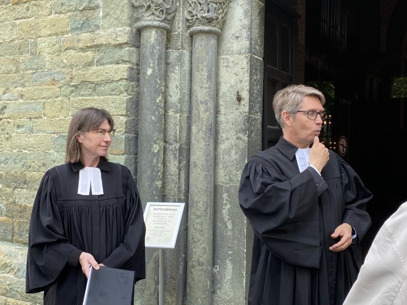 Pfarrerin Heidi Bunse-Großmann und Pfarrer Christian Schröder begrüßten die elf Jubilare schon vor dem Gottesdienst in der Hohnekirche in Soest.
