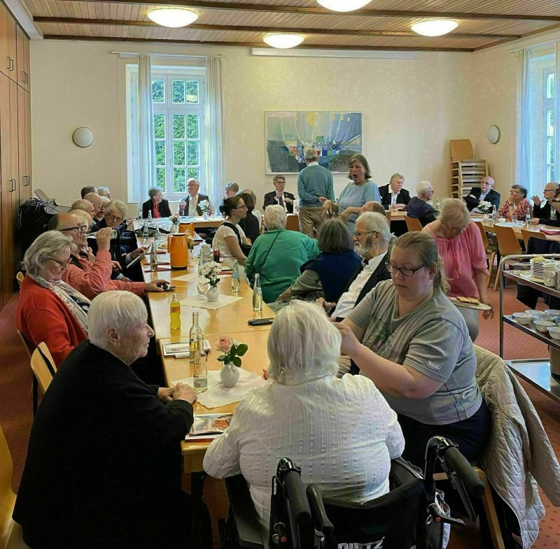 Nach dem Gottesdienst konnten wir im schön geschmückten Gemeindesaal Kaffee trinken und Kuchen essen. Das Mitarbeiterinnen-Team der Soester Gehörlosengemeinde hatten sich viel Mühe gegeben, um alles schön zu decken und zu schmücken.