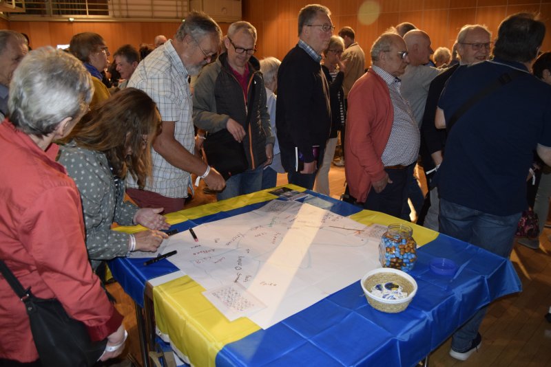 Die ukrainischen Geflüchteten zeigten ihr großes Bild mit der Friedenstaube, auf dem viele Besucher*innen ihren Namen in kyrillischen Buchstaben geschrieben hatten.