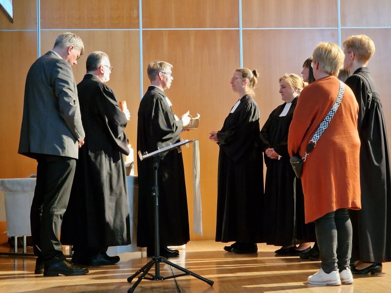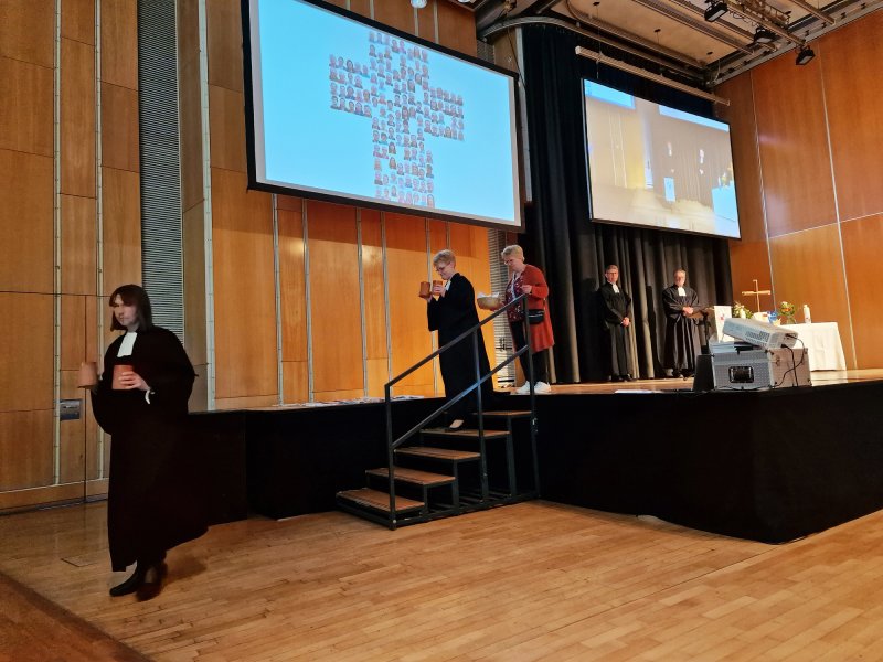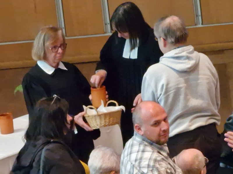 Nach der Einleitung durch Prädikant Detlef Gersmann und Pfarrer Schröder teileten die Pfarrer*innen der westfälischen Gehörlosenseelsorge das Abendmahl aus und Pfarrer Schröder gebärdete den Segen.