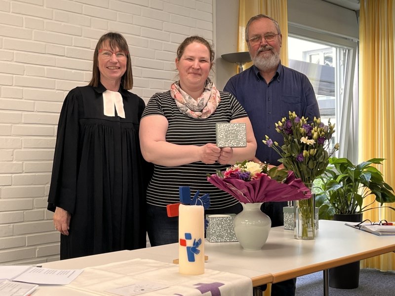 . Ebenso bestätigt wurde Christian Reimann, der schon viele Jahre Gemeindesprecher war. Pfarrerin Heidi Bunse-Großmann segnet beide für ihre Aufgabe. Sie sagt: das Gemeindesprecheramt ist wichtig, um die Arbeit in der Gehörlosengemeinde zu unterstützen. Als Geschenk wird eine Tasse mit den Worten ‚geliebt-getragen-gesegnet‘ überreicht. Die Gottesdienstgemeinde freut sich, dass Elena Zedler nun neu dieses Amt übernommen hat.