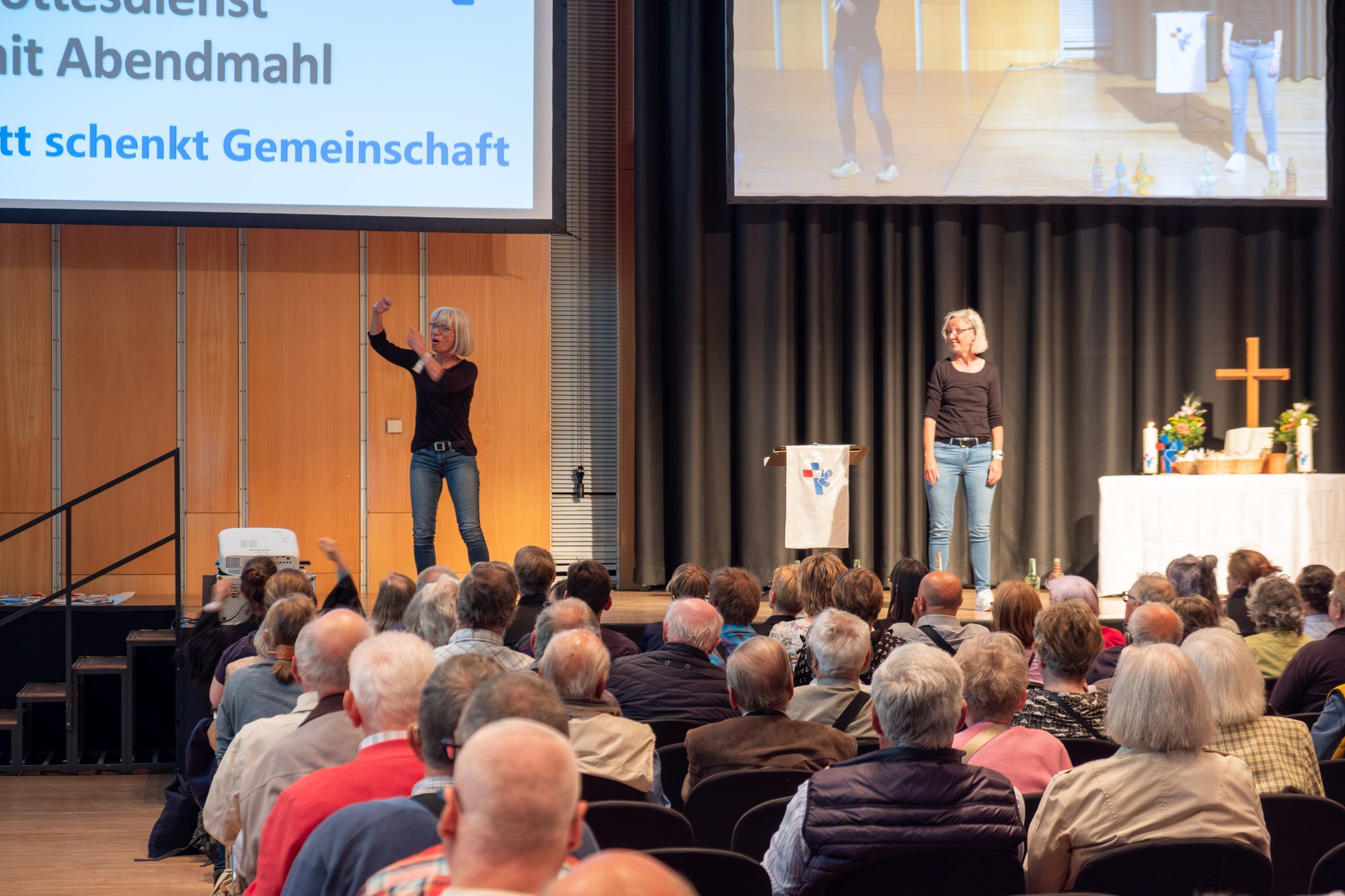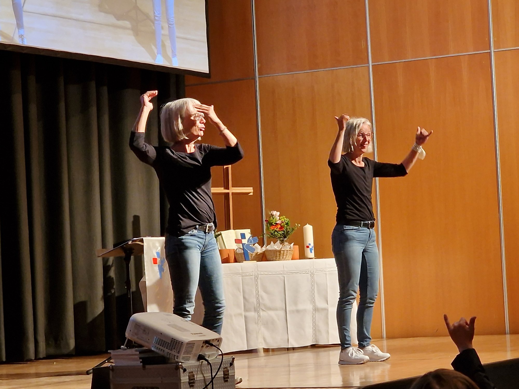 Die Begrüßung und die Einführung in das Thema Gemeinschaft übernahm Pfarrer Christian Schröder. Dann folgte das neue Gebärdenlied zum Thema Gemeinschaft, was Sabine Schlechter und Andrea Soremba mit allen gemeinsam gebärdeten.