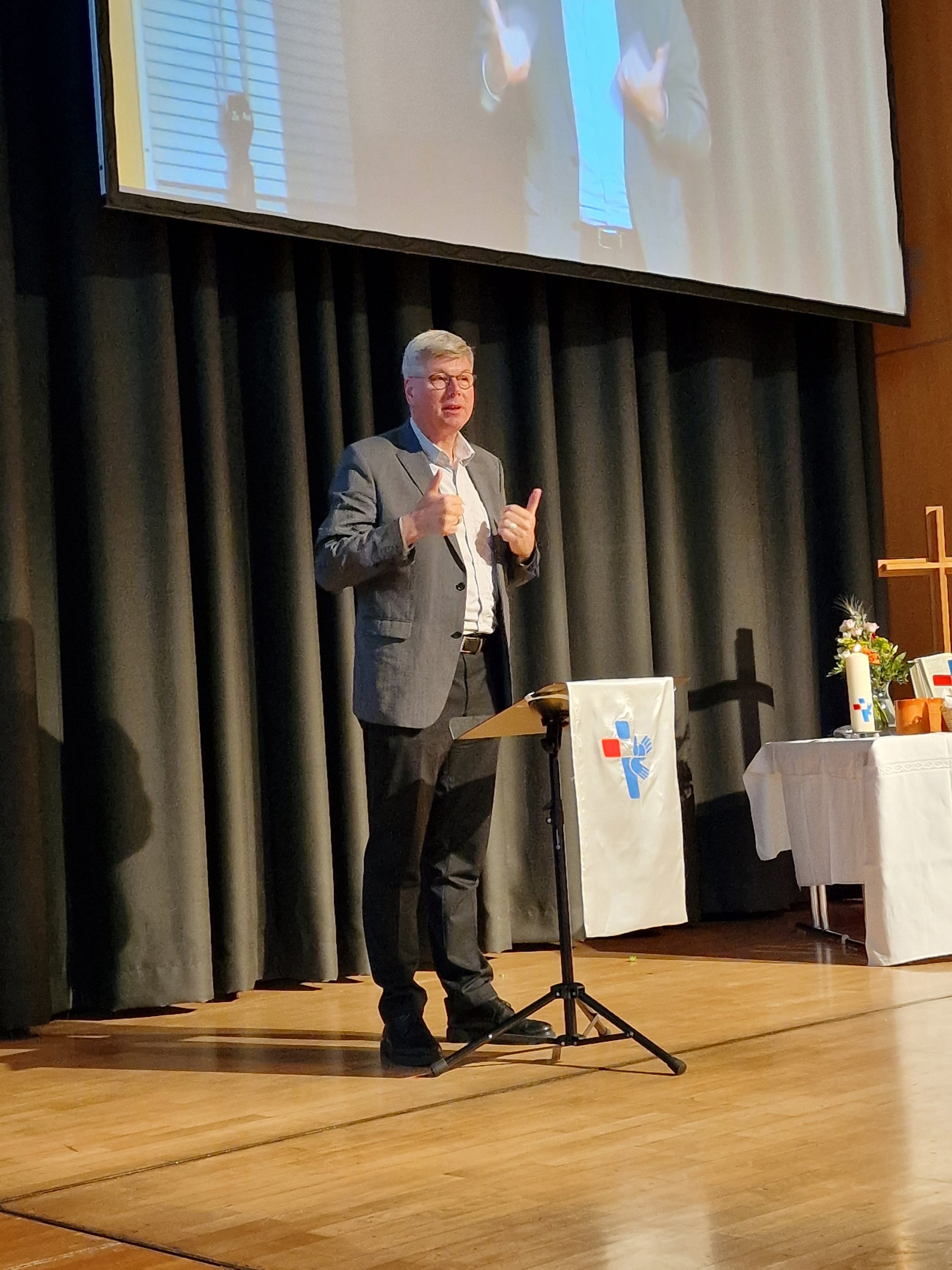 Danach überbrachte Pfarrer Ralf Radix Grüße von der Landeskirche als Referent für Seelsorge der EKvW. Weil er selber früher in der Gehörlosenseelsorge tätig war, konnte er das sogar in Gebärdensprache.